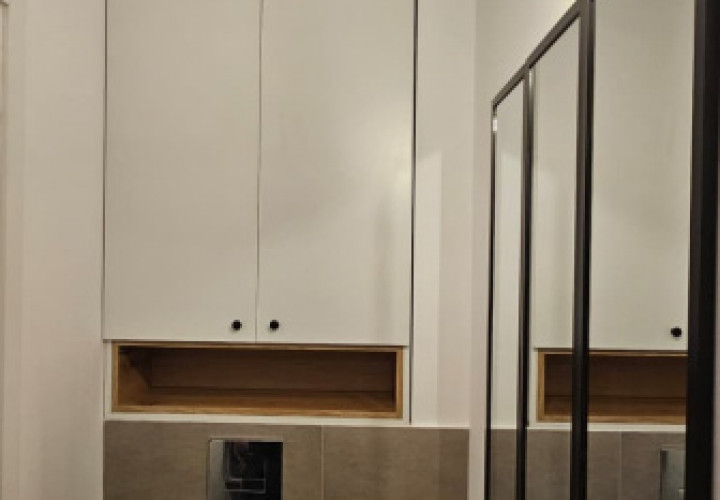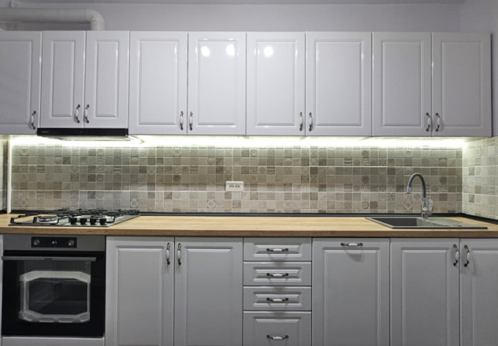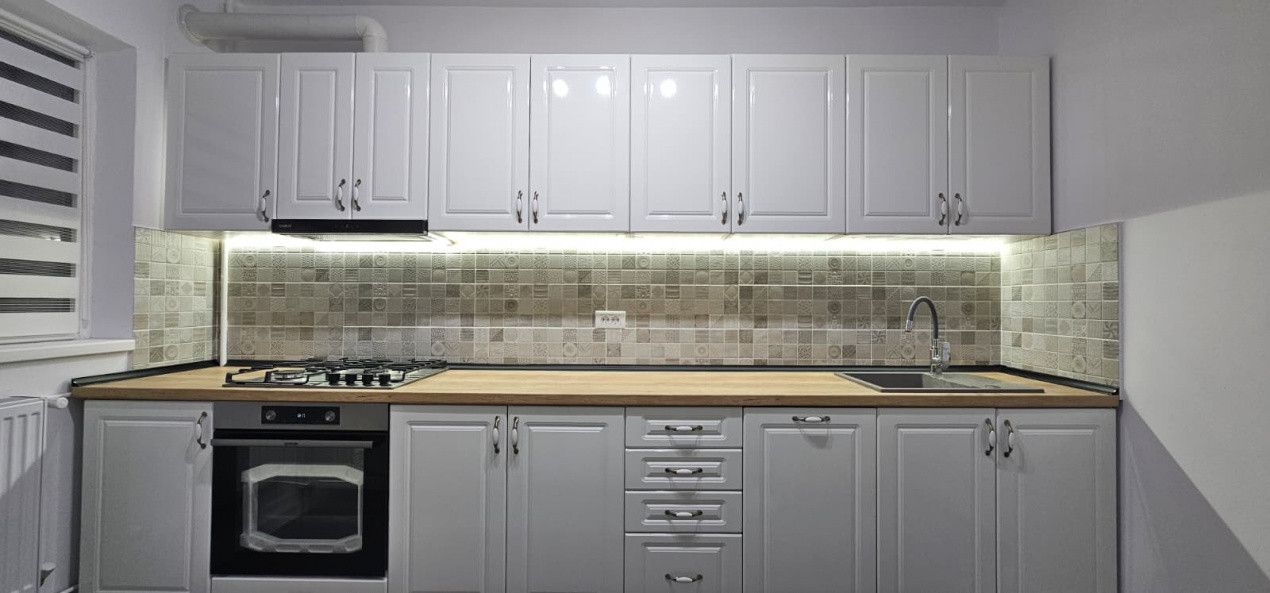 Se vinde mobilat complet, cu mobilier nou, făcut pe comandă, și electrocasnice noi: mașină de spălat rufe, mașină de spălat vase, combină frigorifică, cuptor, plită, hotă.